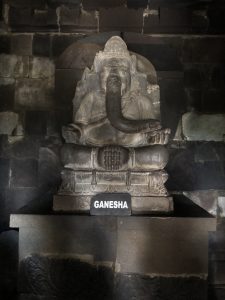 プランパナン遺跡のガネーシャは学問の神様で、インドネシアの受験生がお参りに来て鼻が真っ黒になっている。我が家の学生も鼻を撫でてみた。↓